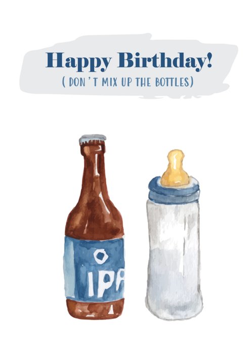 Tijd voor een leuke verrassing! Jij kent iemand die binnenkort jarig is. Stuur deze leuke en vrolijke kaart van Greetz! Op de kaart staat: Happy birthday! (Don't mix up the botles).