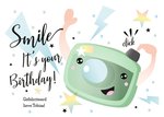 Hiep Hiep Hoera! Er is iemand jarig! Stuur om te verrassen deze leuke vrolijke kaart van Luckz! Op de kaart staat een blije camera en de tekst: Smile it's your birthday! Gefeliciteerd lieve [naam].