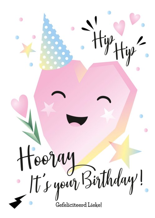 Hiep Hiep Hoera! Er is iemand jarig! Stuur om te verrassen deze leuke vrolijke kaart van Luckz! Op de kaart staat een blij hartje en de tekst: Hooray It's your birthday! Gefeliciteerd [naam].