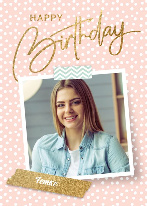 Hiep Hiep Hoera! Er is iemand jarig! Stuur om te verrassen deze leuke vrolijke kaart van Luckz! Op de kaart staat: Happy birthday. Je kunt een naam en foto toevoegen.