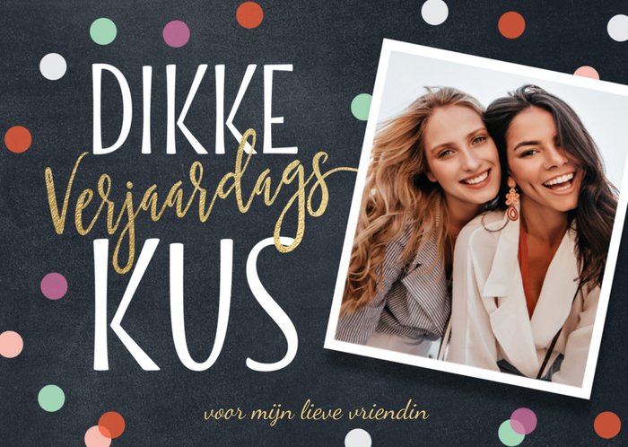Hiep Hiep Hoera! Er is iemand jarig! Stuur om te verrassen deze leuke vrolijke kaart van Luckz! Op de kaart staat: Dikke verjaardagskus voor mijn lieve vriendin. Je kunt een foto toevoegen.