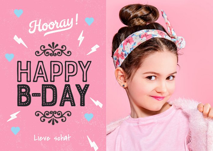 Hiep Hiep Hoera! Er is iemand jarig! Stuur om te verrassen deze leuke vrolijke kaart van Luckz! Op de kaart staat: Hooray! Happy B-day lieve schat. Je kunt een foto toevoegen.
