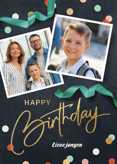 Hiep Hiep Hoera! Er is iemand jarig! Stuur om te verrassen deze leuke vrolijke kaart van Luckz! Op de kaart staat: Happy birthday lieve jongen. Je kunt twee foto's toevoegen.