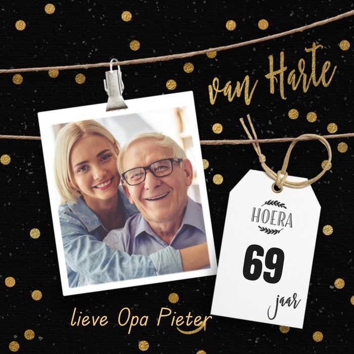 Hiep Hiep Hoera! Er is iemand jarig! Stuur om te verrassen deze leuke vrolijke kaart van Luckz! Op de kaart staat: Van harte lieve opa. Je kunt een naam en foto en leeftijd toevoegen.