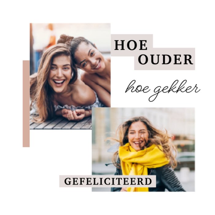 Stuur deze leuke verjaardagskaart naar iemand om te verrassen. Je kunt twee leuke foto's toevoegen. Ook staat er de tekst: hou ouder hoe gekker. Gefeliciteerd.