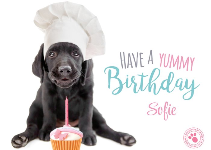 Op deze kaart zie je een puppy met een koksmuts op die bij een cupcake zit. Daarnaast staat de tekst: have a yummy birthday.