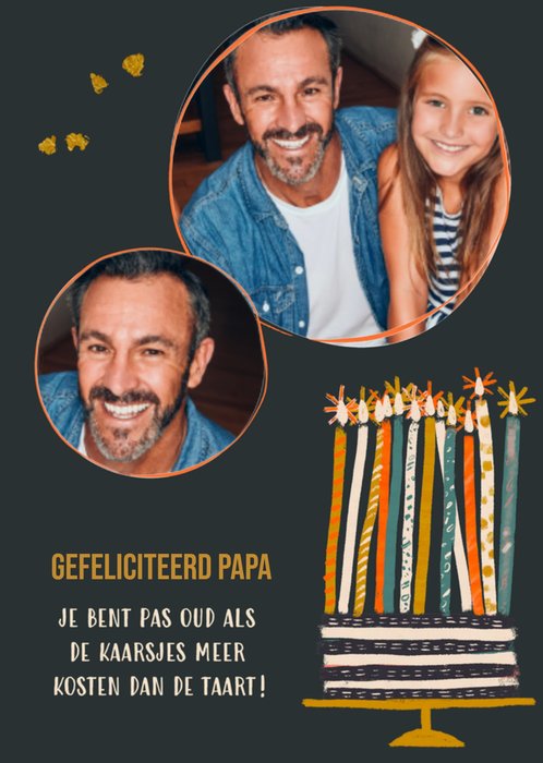 Wens je vader een fijne verjaardag met deze lieve kaart met kaarsjes. Op de kaart staat: Gefeliciteerd papa. Je bent pas oud als de kaarsjes meer kosten dan de taart! Ook kun je twee foto's toevoegen.