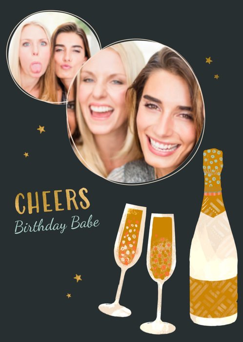 Wens je babe een fijne verjaardag toe met deze verjaardagskaart met daarop een fles champagne, twee glazen en de tekst: Cheers birthday babe. Je kunt twee leuke eigen foto's toevoegen.