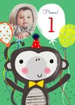 Zijn eerste verjaardag! Stuur deze leuke kaart met een aapje en ballonnetjes. Ook kun je een foto toevoegen.