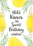 Leuk kaartje van Tsjip met de tekst: hugs kisses and sweet birthday wishes! Daaromheen zie je takjes en gele rondjes.