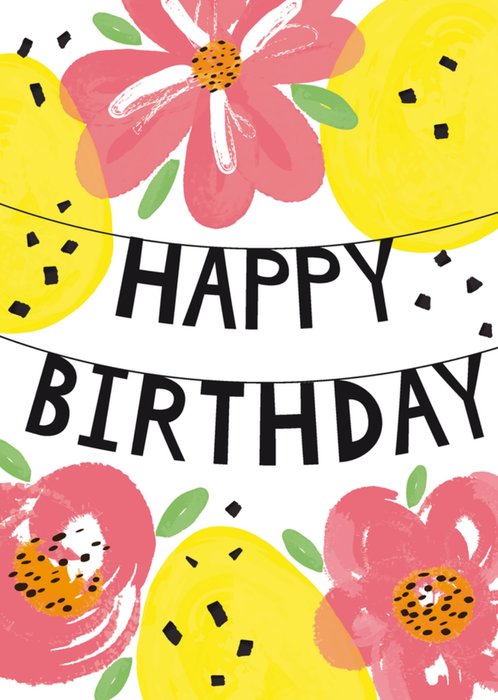 Een vrolijke verjaardagskaart van Tsjip met bloemen en de tekst: Happy birthday.