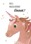Wat leuk! Jij kent iemand die haar verjaardag viert. Stuur deze lieve kaart met unicorn als verrassing! Op de kaart staat: Have a magical birthday [naam].