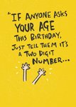 Wens iemand een fijne verjaardag met deze leuke kaart van UK Greetings. Op de kaart staat: If anyone asks your age this birthday, just tell them it's a two digit number.
