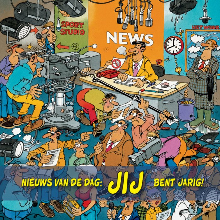 Grappige verjaardagskaart van Jan van Haasteren, met tekening van een 'newsroom'.