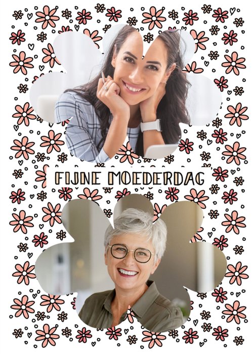 Vrolijke moederdagkaart met madeliefjes, een 2 fotos, en de tekst: 'Fijne moederdag.' Verras je mama met deze leuke moederdagkaart van YH Tekent.