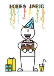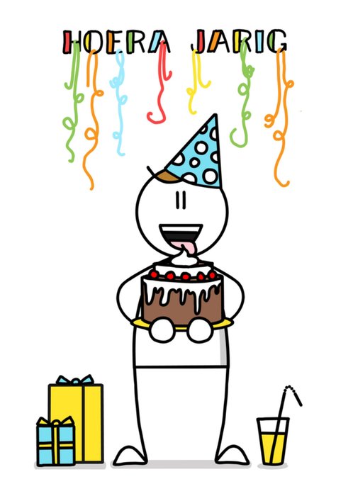 Vrolijke verjaardagskaart met illustratie en de tekst: Hoera jarig.