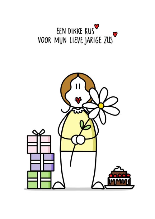 Kleurrijke verjaardagskaart met een vrouw met een madeliefje, cadeautjes en verjaardagstaart. De tekst: 'Een dikke kus voor mijn lieve jarige zus.' Verras je zus met deze leuke verjaardagskaart van YH Tekent.