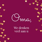 Een mooie diep rode kaart met gouden hartjes en de tekst: Oma, we denken veel aan u.