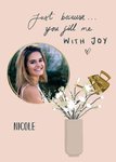 Verras je liefje met een leuke en schattige zomaar kaart van Greetz! Op de kaart staat: Just because you fill me with joy. Ook kun je een foto en een naam toevoegen.