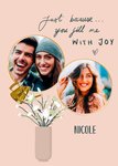 Verras je liefje met een leuke en schattige zomaar kaart van Greetz! Op de kaart staat: Just because you fill me with joy. Ook kun je twee foto's en een naam toevoegen.