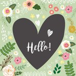 Een groene kaart met bloemen. In het wit staat op de kaart "Hello!".